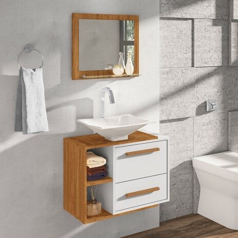 O Conjunto para Banheiro Barcelona é ideal para sua casa! Composto por Gabinete, Cuba de Apoio e Espelheira. O Gabinete é elaborado em MDP, possui 1 porta com dobradiças metálicas e 1 gaveta com corrediças metálicas. Seus puxadores são de MDF Revestido que proporcionam charme e requinte ao móvel. Espelheira com espelho 450 x 350 x 3mm e prateleira de vidro temperado de 4mm com suportes metálicos cromados. Cuba de apoio com designer moderno que torna o gabinete ainda mais bonito. O Conjunto para Barcelona combina beleza e qualidade, todas as características que você procura em um móvel.